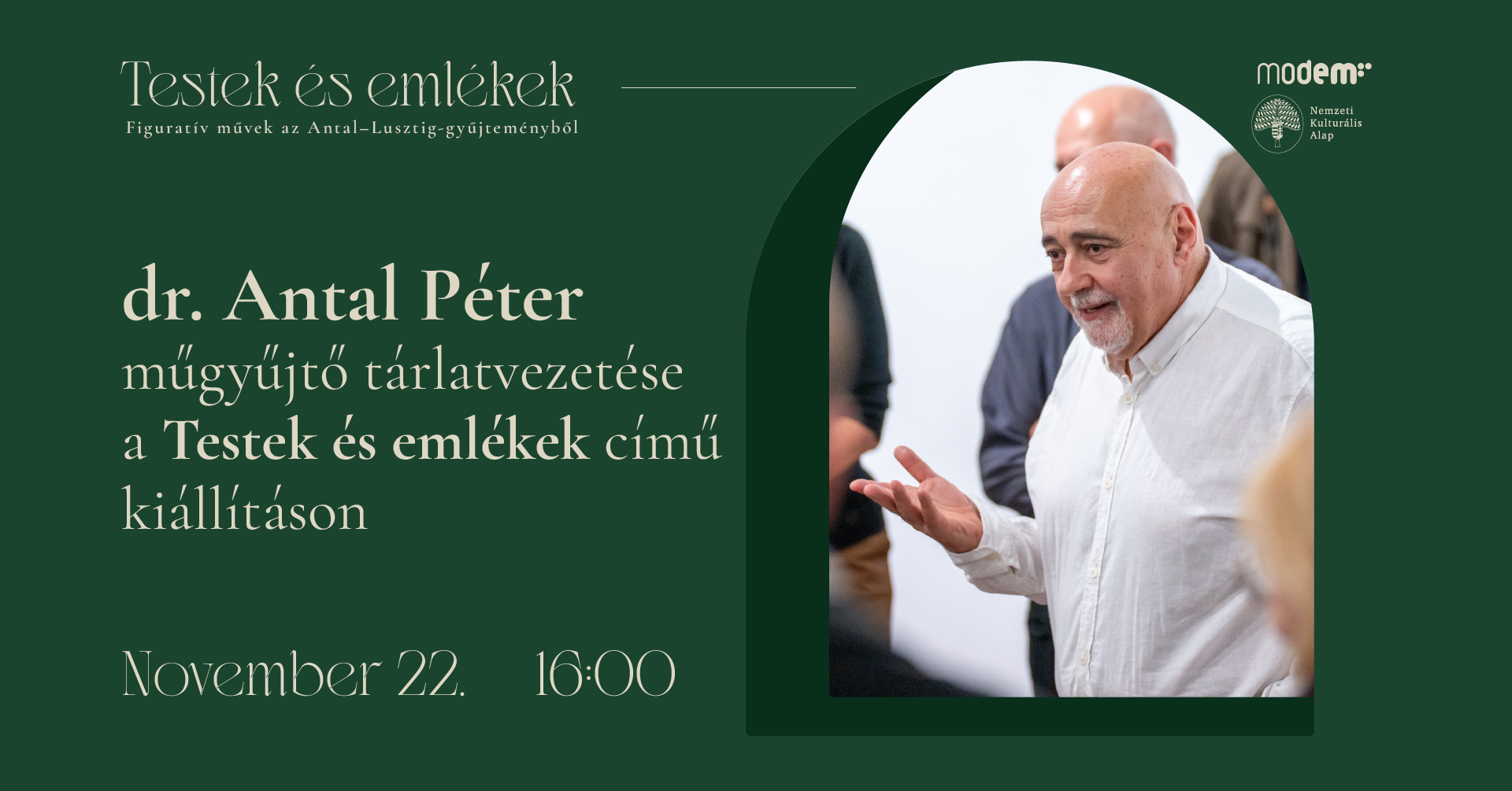 Szeretettel várunk mindenkit dr. Antal Péter műgyűjtő tárlatvezetésére a Testek és emlékek - Figuratív művek az Antal-Lusztig-gyűjtemény című kiállításon november 22-én, 16 órakor a MODEM-ben!
